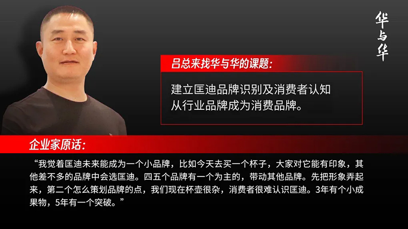 有了很雄厚的實力和很恰當(dāng)?shù)臅r機,呂總就希望建一個品牌,讓人能夠知道他的匡迪,希望大家今天去買一個杯子,讓大家對匡迪能有印象。所以2023年來找華與華,開啟了匡迪的品牌建設(shè)之路。
