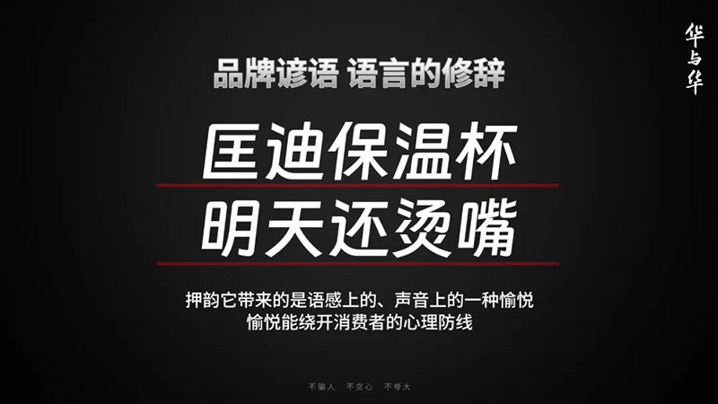 “匡迪保溫杯,明天還燙嘴”也押韻,押韻就能創(chuàng)造一種愉悅,而這種愉悅,它就能繞開消費者的心理防線。消費者不僅接受了,還很開心,開開心心就能說給別人聽,讓它易于播傳。