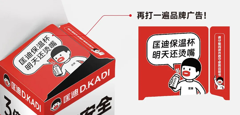 我們用“明天還燙嘴”這樣的修辭,來強調(diào)匡迪保溫杯保溫的性能——燙嘴!舌頭都燙痛了!這是一個有母體的場景,也是大家共同的經(jīng)歷經(jīng)驗。而且很多保溫杯,本來就要貼個“小心燙嘴”的提示。