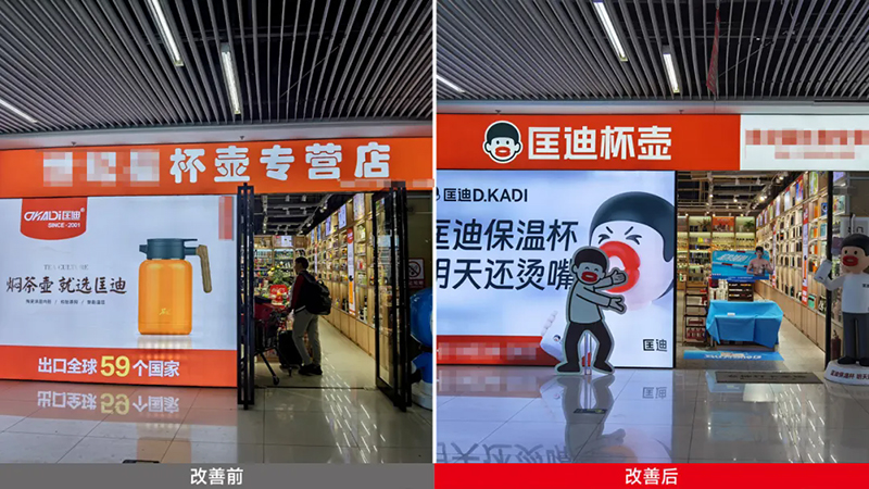 走進門店,你會發(fā)現(xiàn)我們把原來的貨架改造成了“發(fā)光海報”,匡迪的標(biāo)志、燙嘴哥形象和企業(yè)背書全都亮在那里,讓人不由自主想進店一探究竟。