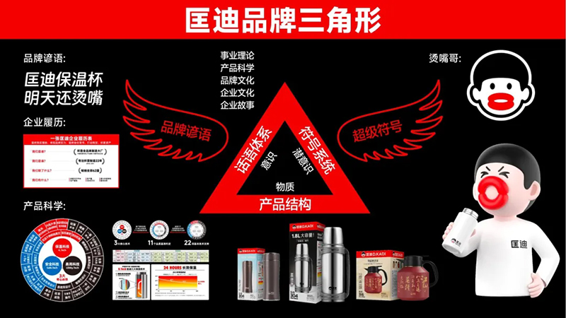 當(dāng)我們極具戲劇性的“匡迪保溫杯,明天還燙嘴”的口號,以及“燙嘴哥”的超級符號出來后,大眾跟它的隔閡就瞬間消失了,這就是超級符號的創(chuàng)意力量。
